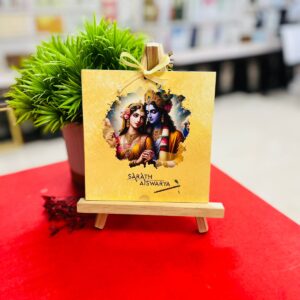 Budget-friendly 2-piece card made from 300 GSM thick board, sized 15.8 cm x 15.8 cm, with vibrant full-color digital print, glossy finish, and custom design. Attached with a colorful small ribbon for a stylish touch.